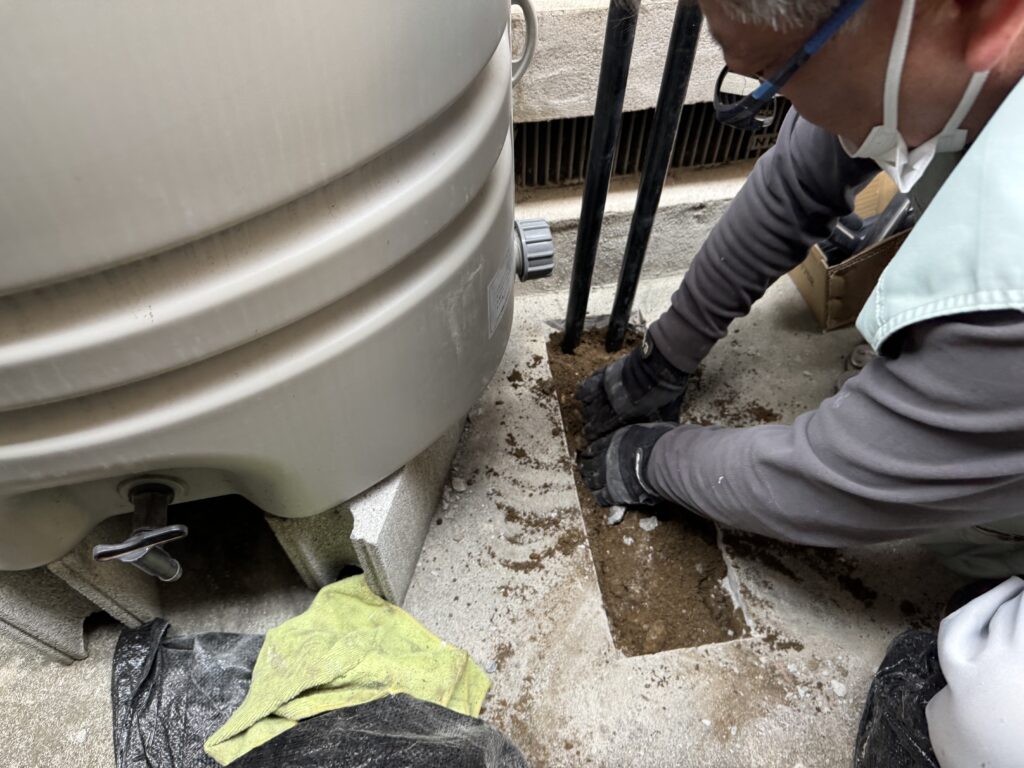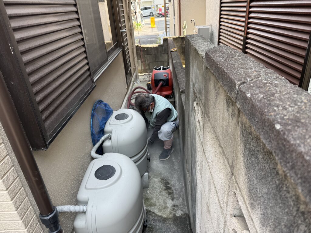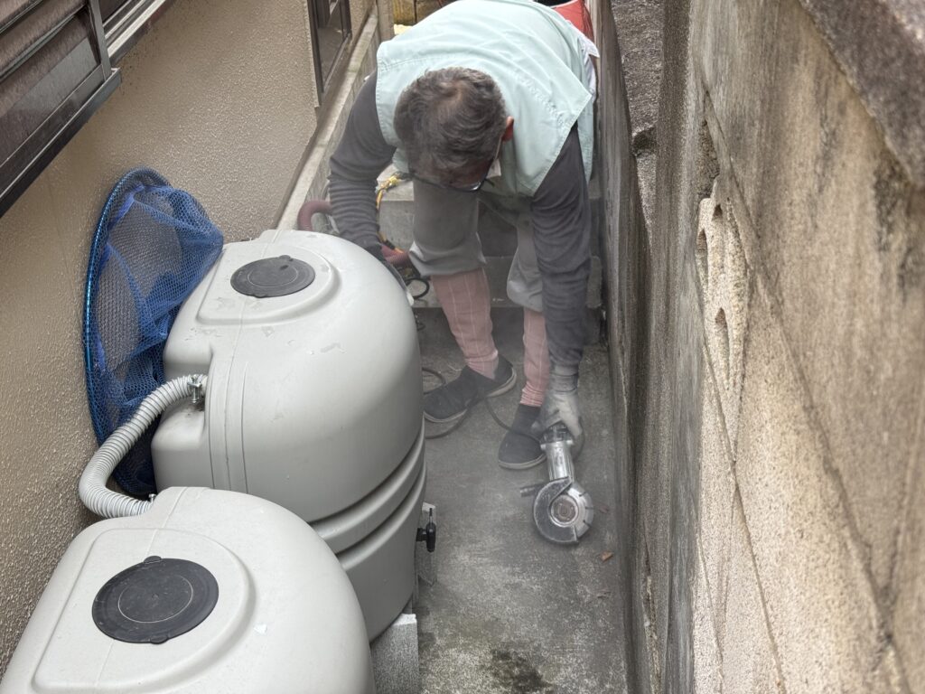 巨大な雨水タンクが二つ並んでおり、その先で配管を探していくしかありませんね。