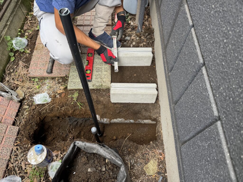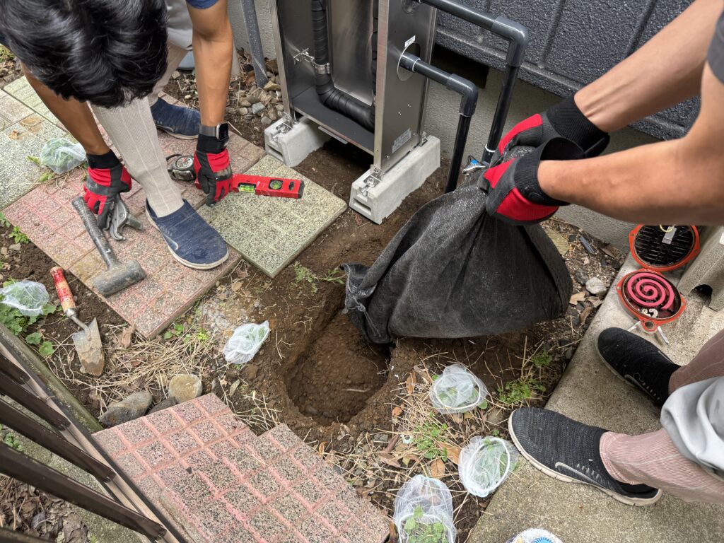 タイルをどかし、汚水桝付近を掘り進めて行きます。