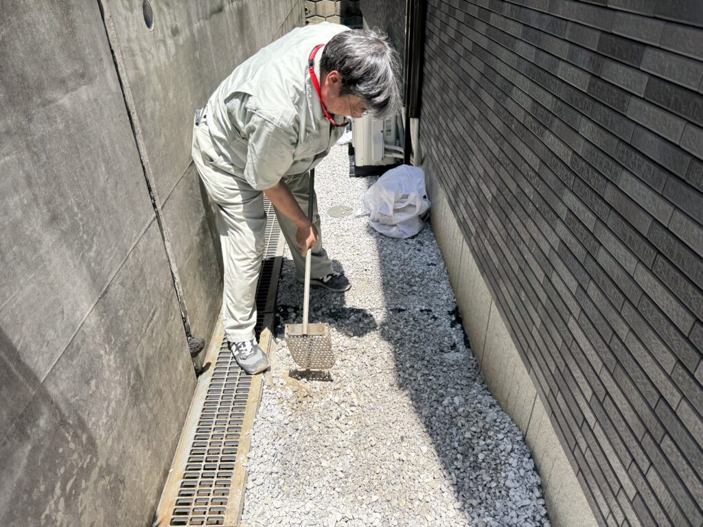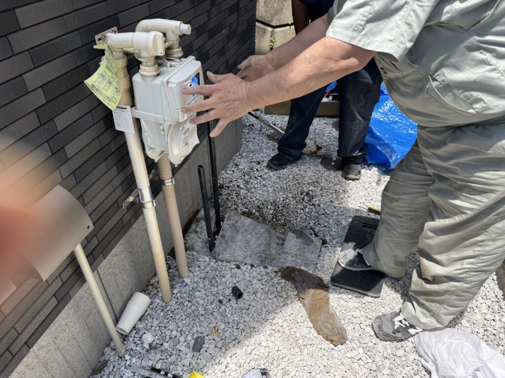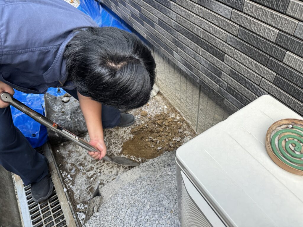配管探しの為、砂利をはいてから土を掘り返していきます。
