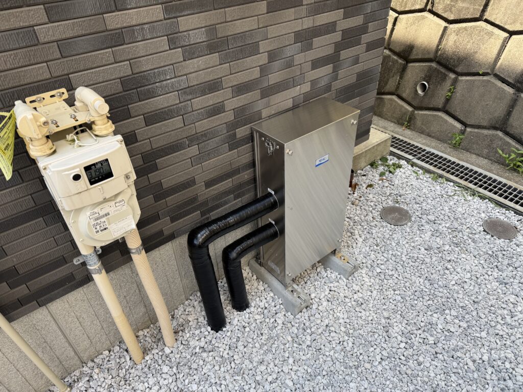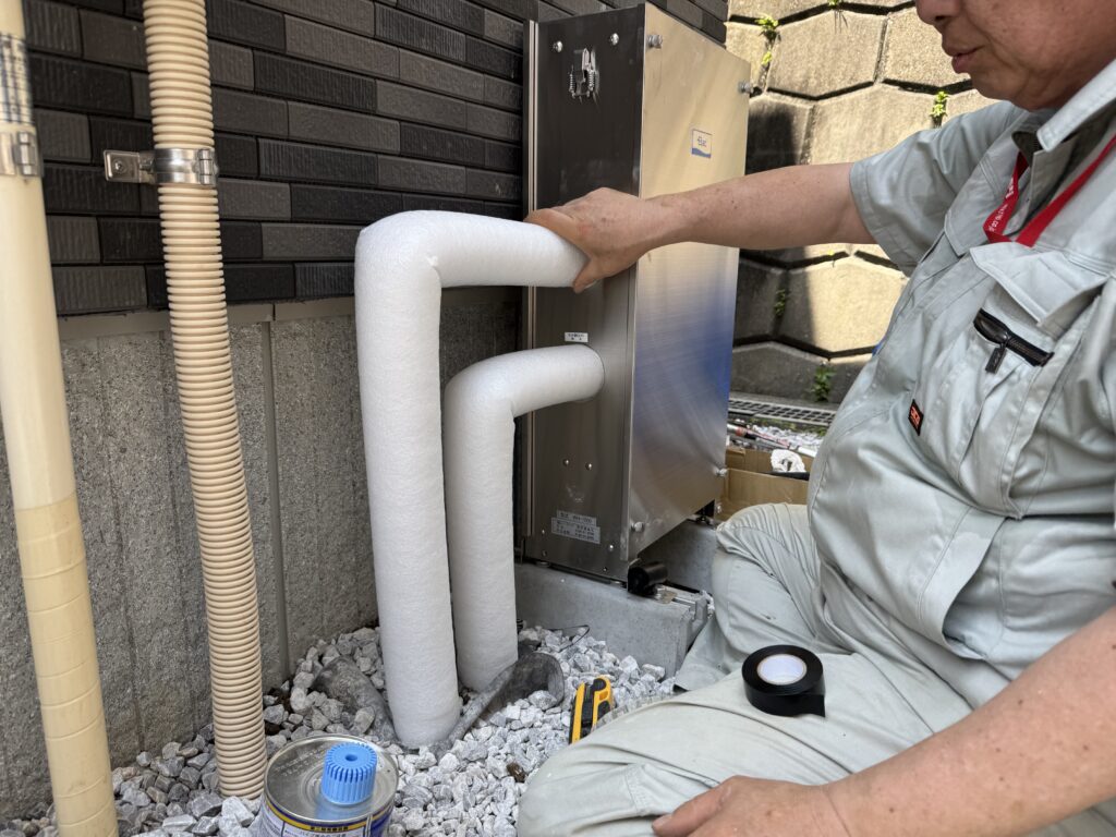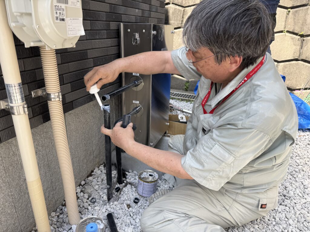 本体を設置しのち、立ち上げた配管と繋げていきます。
