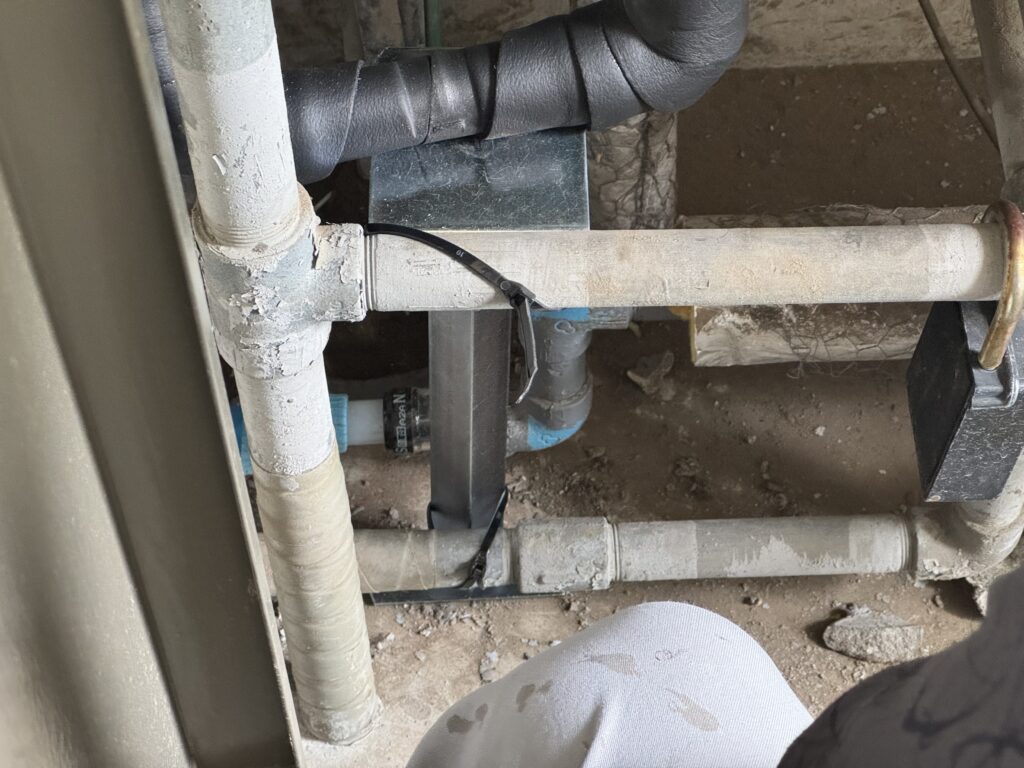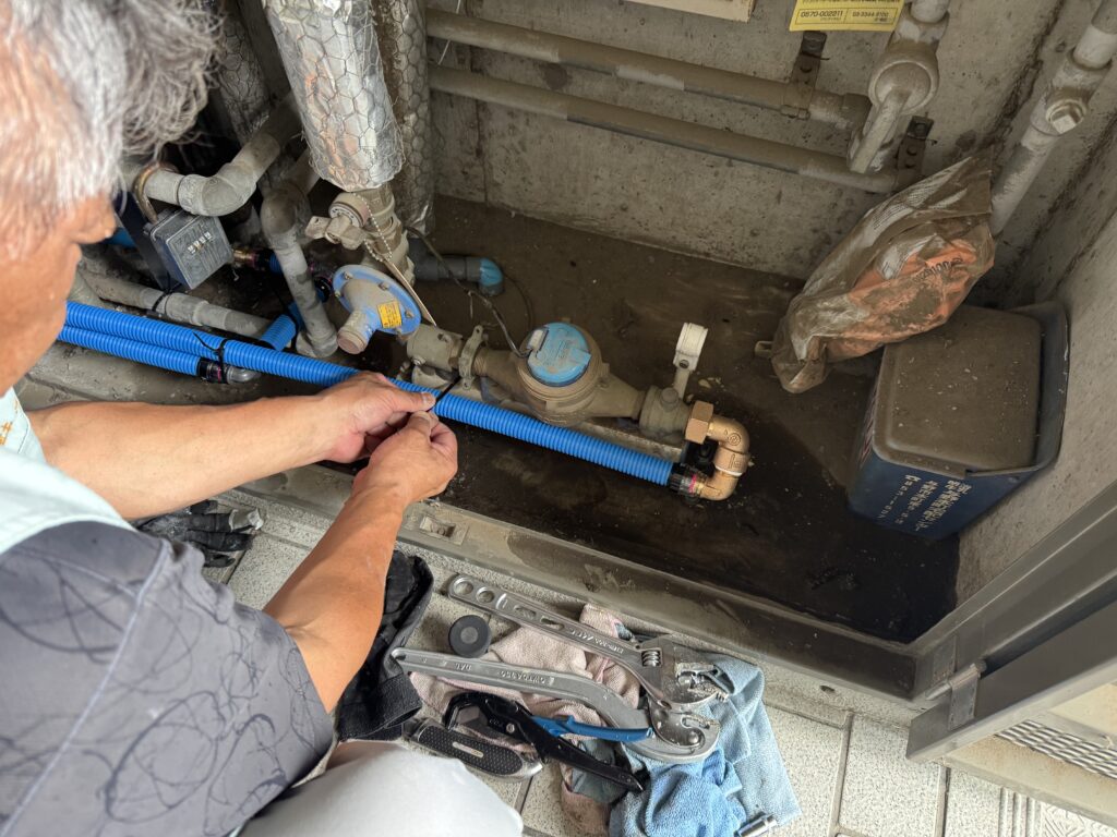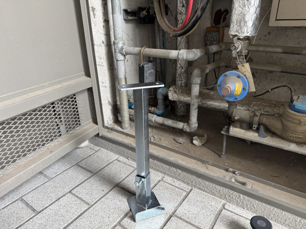 土台の足もグラグラしないよう、周りのガス管と結び付けています。