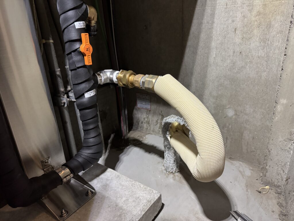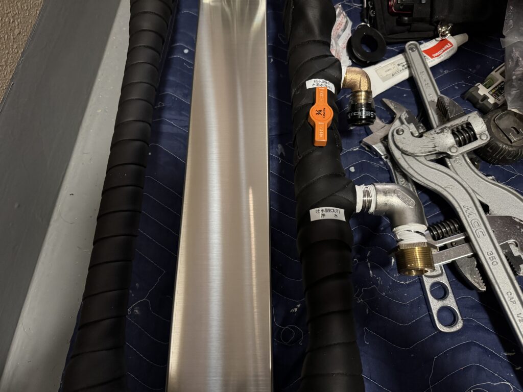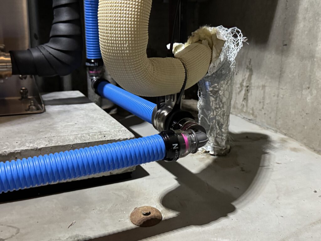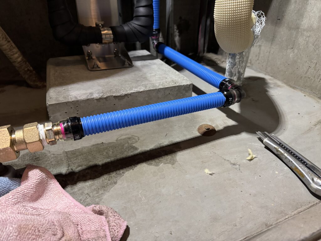アウト側に関しては、原状がフレキ管になっているので いつものようにポリ管は使わず、