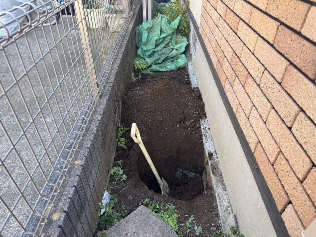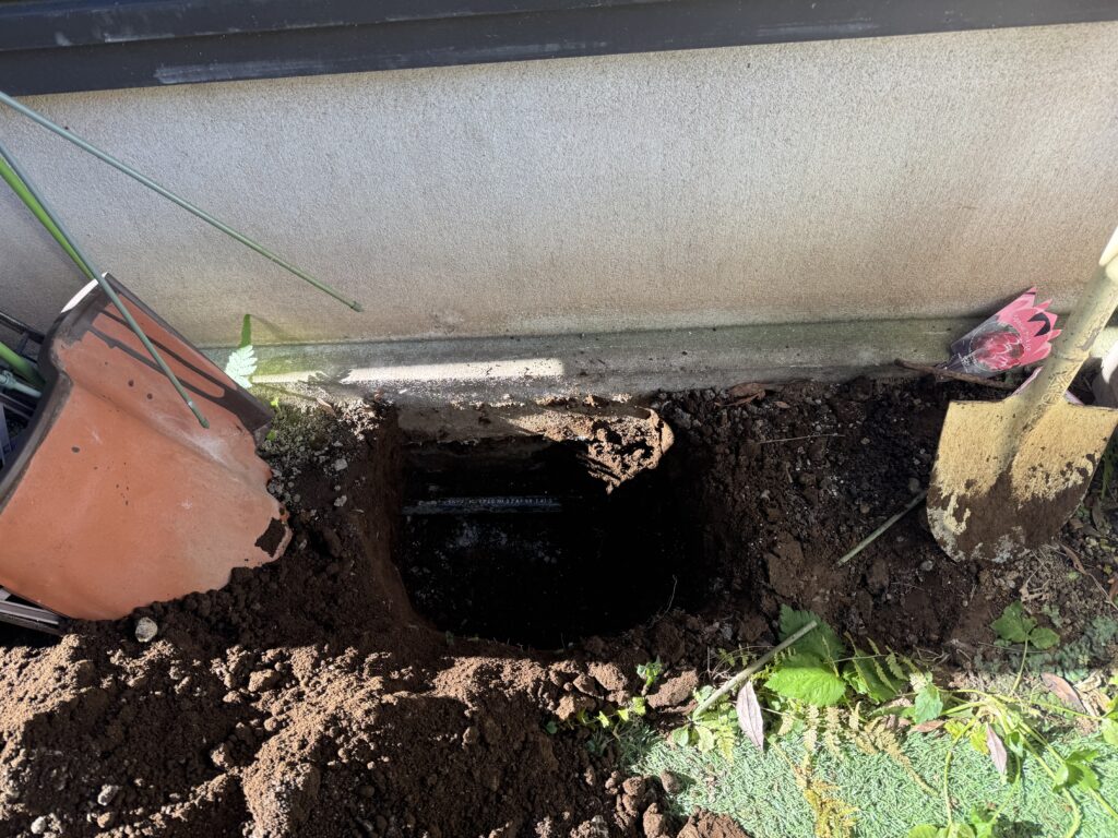 ひたすら掘り進めて行くと、基礎の際を配管が走っていました。