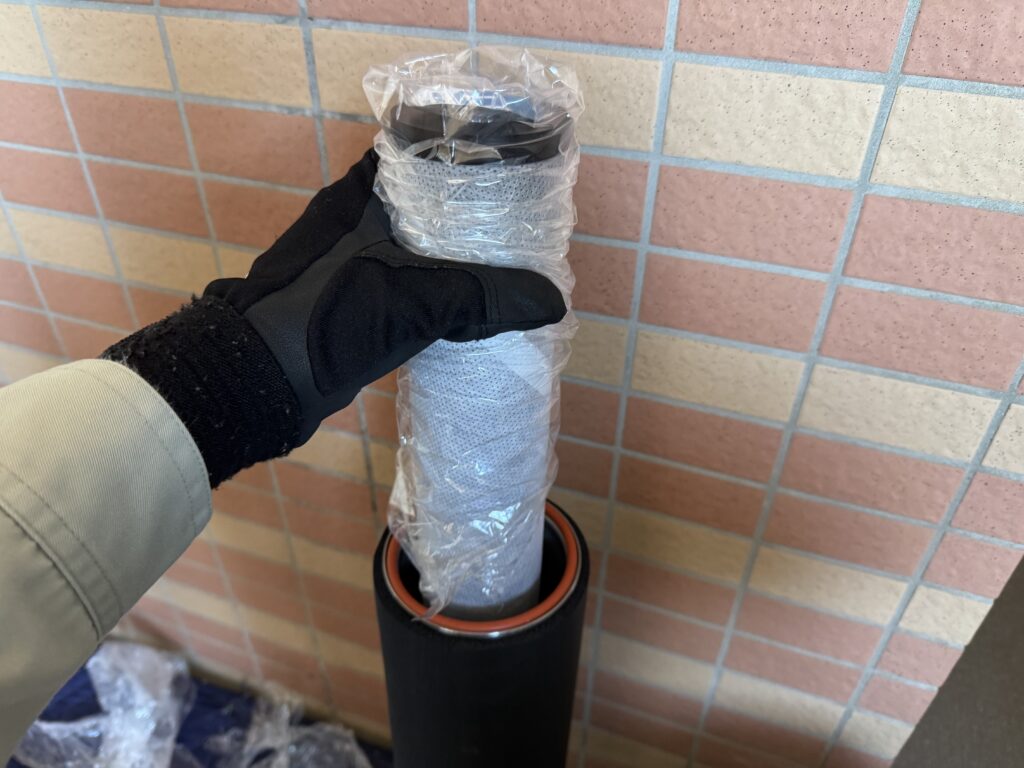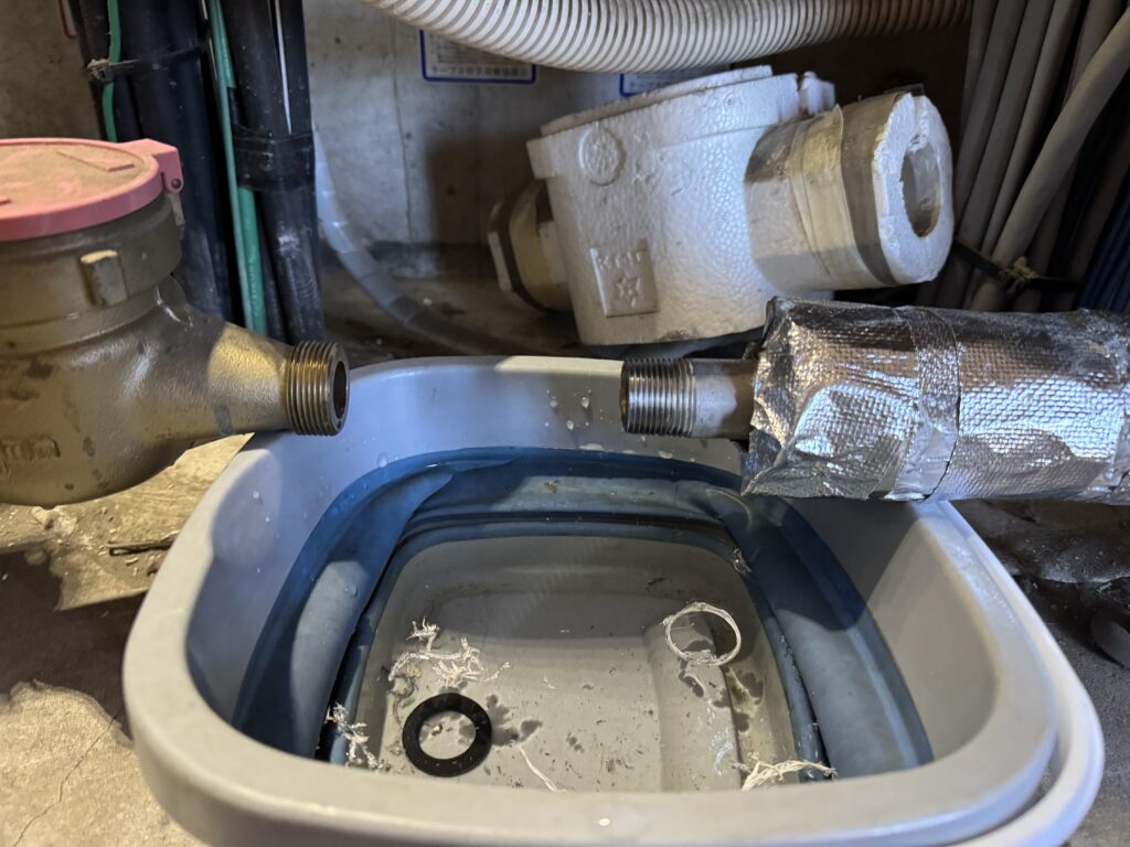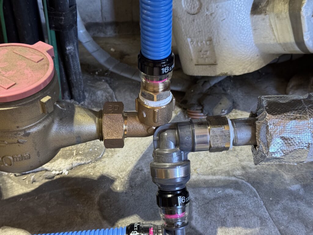 水道メーターのカバーを正しい位置に戻し、イン側の配管は