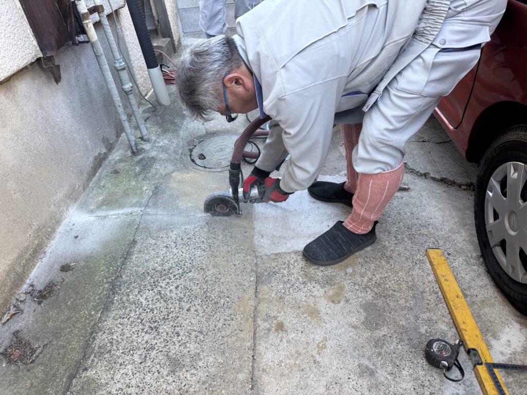 例のごとく、斫る範囲をサンダーで切り取ります。
