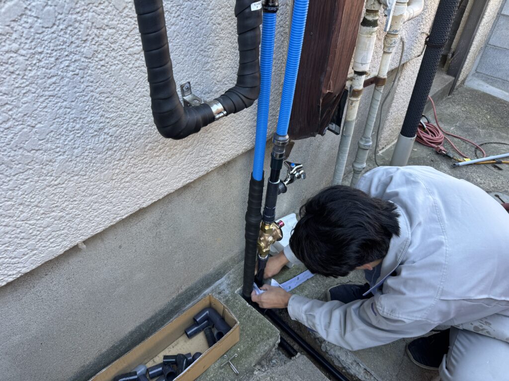 ここから、壁側まで配管を伸ばしていきます。