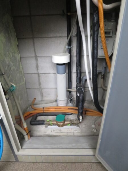 設置予定場所のパイプシャフト(点検スペース)はまずまずの広さがあるものの配管が床面にあり壁掛けしたいところ。ただ、今回はねじを使わない工事をするため自立型を選択。
