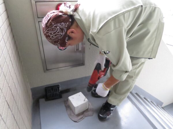 持参したコンクリートブロックにアンカーを打ち込んで浄水器を固定する準備をします。
