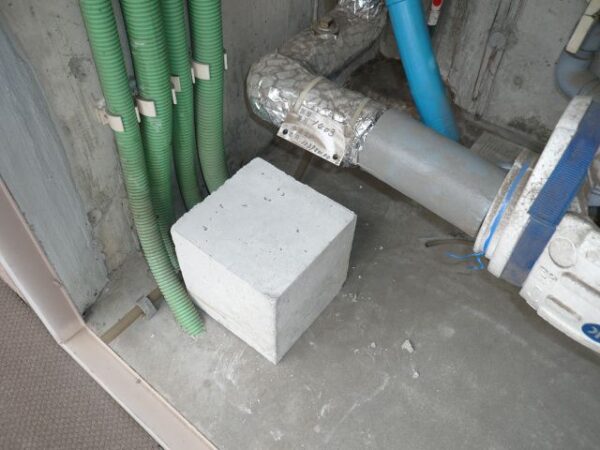 設置場所に一切手を加えない約束なので、持参したブロックに浄水器を固定します。
