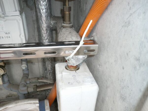 しかし申請済みなので、今回はインシュロック(プラスチックバンド)でアングルを既存配管にくくりつけて固定。